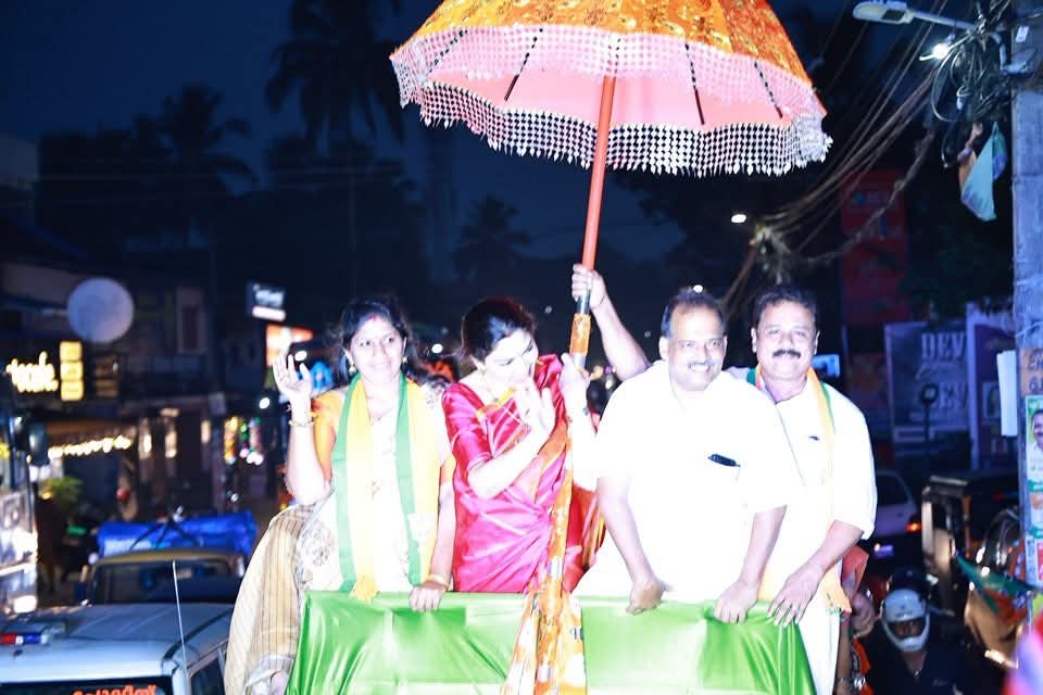 തൃശ്ശൂർ നഗരത്തെ ഇളക്കിമറിച്ച് ബിജെപി നേതാവ് ഖുശ്ബു സുന്ദറിന്റെ റോഡ് ഷോ. അയ്യന്തോളിലെ അമർജവാനിൽ പുഷ്പാർച്ചന നടത്തി തുടങ്ങിയ മഹിള റോഡ് ഷോയിൽ നൂറു കണക്കിന് വനിത പ്രവർത്തകർ അണി നിരന്നു. വാദ്യ മേളങ്ങൾക്കും വനിതാ പ്രവർത്തകരുടെ ആരവങ്ങൾക്കിടയിലേക്കുവാണ് ബിജെപി നേതാവായ ഖുശ്ബു ഇറങ്ങിയത്. തുടർന്ന് അയ്യന്തോളിലെ അമർജവാനിൽ പുഷ്പാർച്ചന നടത്തി.