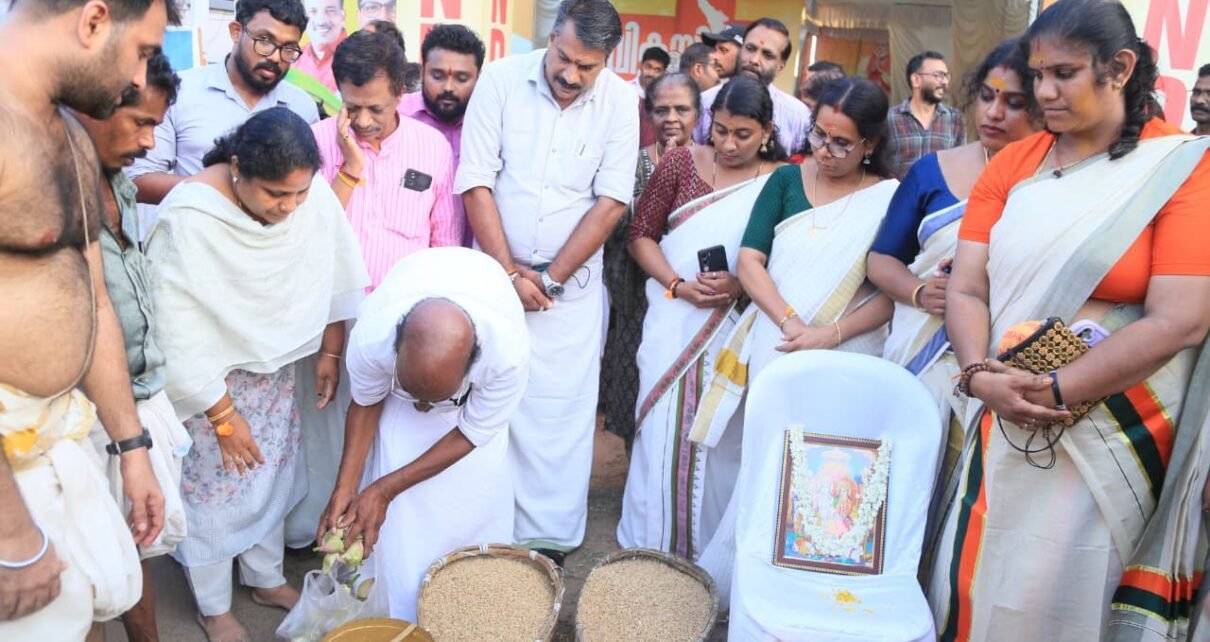 തൃപ്രയാർ തേവരുടെ പൂരം പുറപ്പാട് ആരംഭദിനത്തിൽ താമരപ്പൂ പറ നിറച്ച് നാട്ടിക മണ്ഡലം എൻഡിഎ സ്ഥാനാർത്ഥി സിസി മുകുന്ദൻ. എൻഡിഎ തെരഞ്ഞെടുപ്പ് കമ്മിറ്റി ഓഫീസിന് മുൻപിൽ താമരപ്പൂ പറയും നെൽപ്പറയും എൻഡിഎ പ്രവർത്തകരുടെയും ഭക്തരുടെയും സാന്നിദ്ധ്യത്തിലാണ് സ്ഥാനാർത്ഥി നിറച്ചത്.
