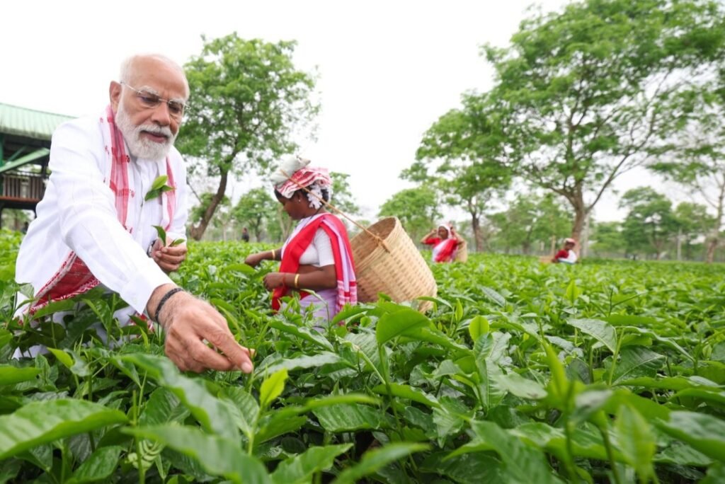ദിബ്രുഗഡ്: അസം തേയിലത്തോട്ടവും തോട്ടം തൊഴിലാളികളേയും സന്ദര്ശിച്ച് പ്രധാനമന്ത്രി നരേന്ദ്രമോദി. തോട്ടം തൊഴിലാളികളെ സന്ദര്ശിച്ച പ്രധാനമന്ത്രി അവരുടെ പ്രശ്നങ്ങള് ആരായുകയും അവരുടെ കൂടെ തേയില പറിക്കാന് സഹായിക്കുകയും ചെയ്തു.