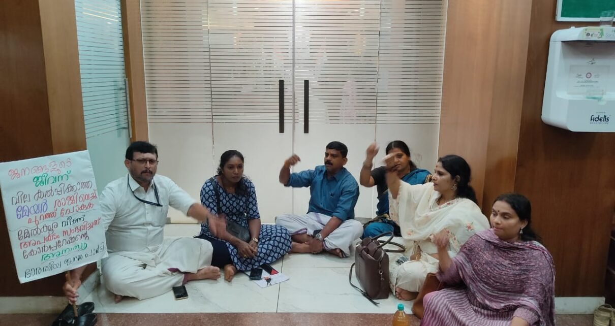 മേയർ ജനകീയ ചോദ്യങ്ങളിൽ നിന്ന് ഒളിച്ചോടുന്നു: തൃശൂർ കോർപ്പറേഷൻ ബിജെപി കൗൺസിലർമാരുടെ ഉപരോധ സമരം